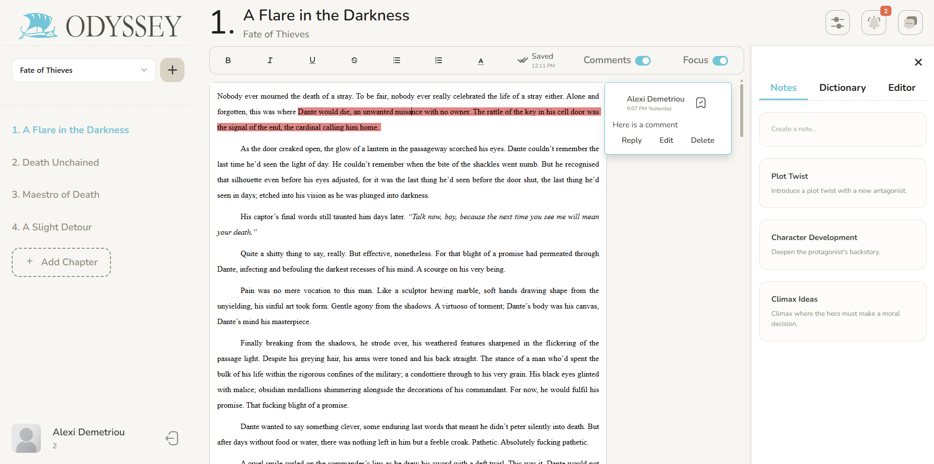 Leave quick reminders, edits, or feedback without breaking your flow. Whether you're revising your own work or collaborating with a critique partner, Odyssey’s inline comments help you keep thoughts exactly where they belong — right on the page.